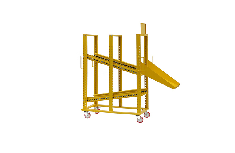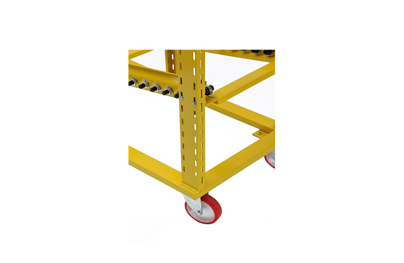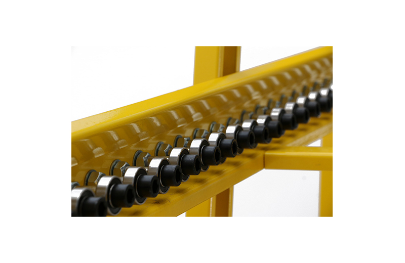 - Système de roulage : Rouleaux gravitaires à billes en acier montés sur rails inclinés pour un glissement fluide des bacs ou pièces.