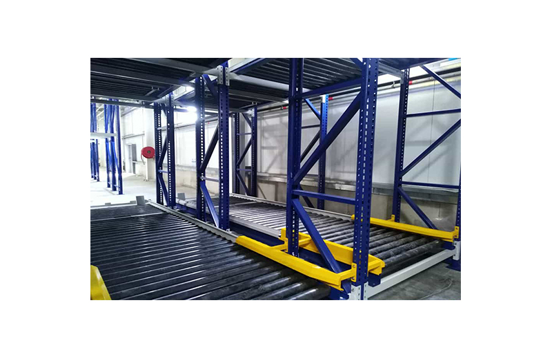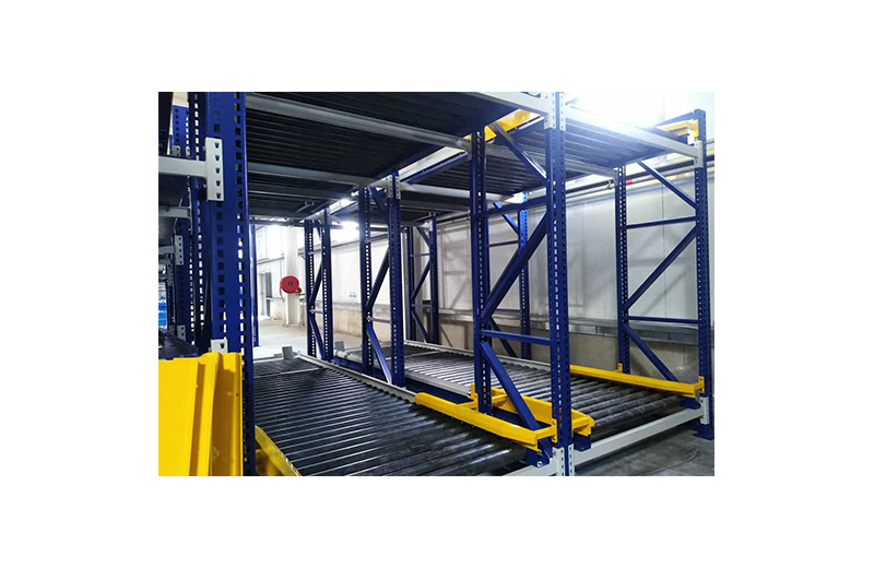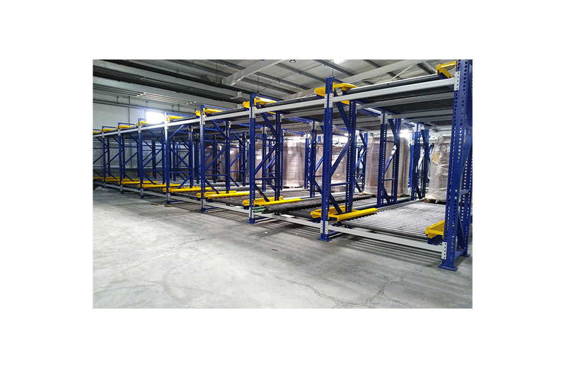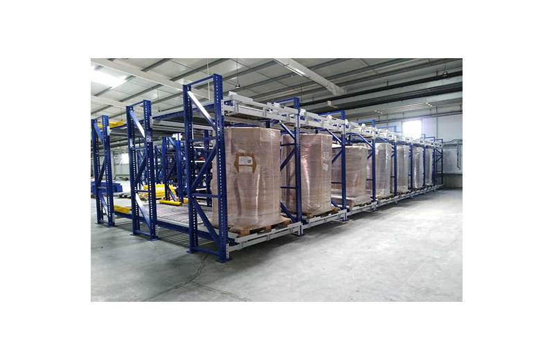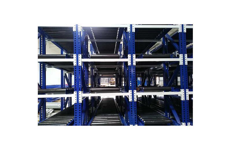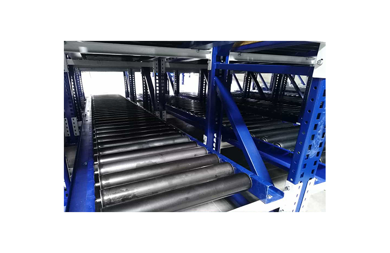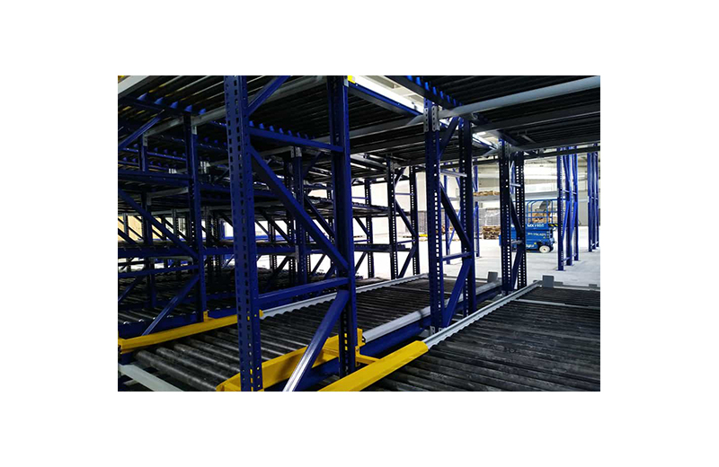 Les rayonnages sont composés de cadres métalliques et de rails à galets légèrement inclinés, ce qui facilite la parfaite entrée et sortie du matériel. La marchandise est déposée à l’une de leurs extrémités, puis entraînée par gravité vers l’extrémité opposée qui donne sur l’allée de sortie. Ainsi ce système garantit la parfaite rotation du produit, évite les interférences dans les tâches de réassort et de recueil du matériel et accélère la préparation des commandes. Afin de rendre plus rapide le prélèvement du matériel, des dispositifs gérés par le logiciel peuvent être incorporés.