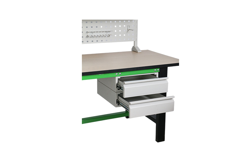 - Bloc métallique à 2 tiroirs monté sous le plan de travail (côté droit)